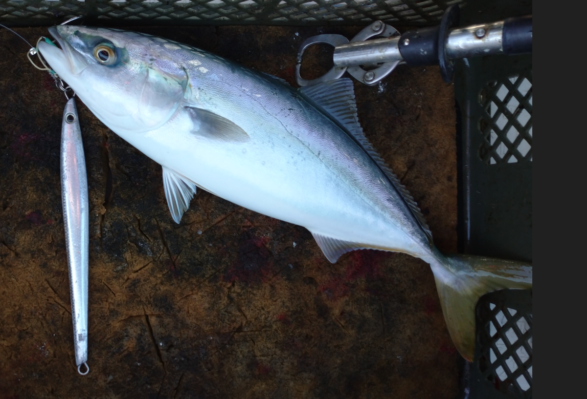 とりあえずポイント到着!!潮回りとしても、そこまで流れる時間ではありません。まず最終兵器(まず「最終」兵器って変な日本語)、スピニング+シマノ/キングスラッシャー/135g/シルバーで探っていきます。底とってキビキビとアクション、「まー釣れるんじゃない?」と思える程度の良い感じの引き抵抗です。で、1流し目か2流し目でヒット、ハマチゲットです。そんな感じで、朝イチでこのタックルでハマチ×3匹まで積み上げます。できる子ではないか!!